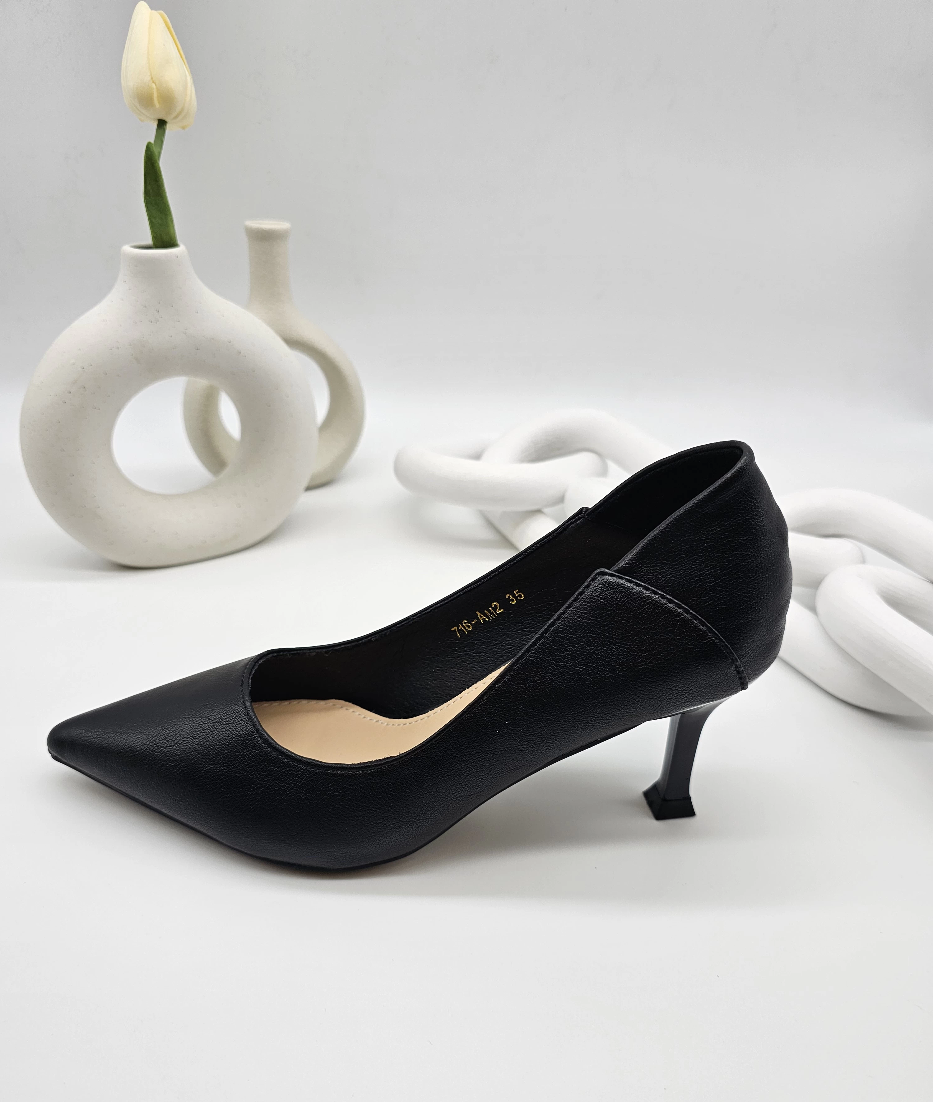 حذاء اسود انيق بتصميم فريد مدبب من الامام مصنوع من الجلد ذو كعب عالي