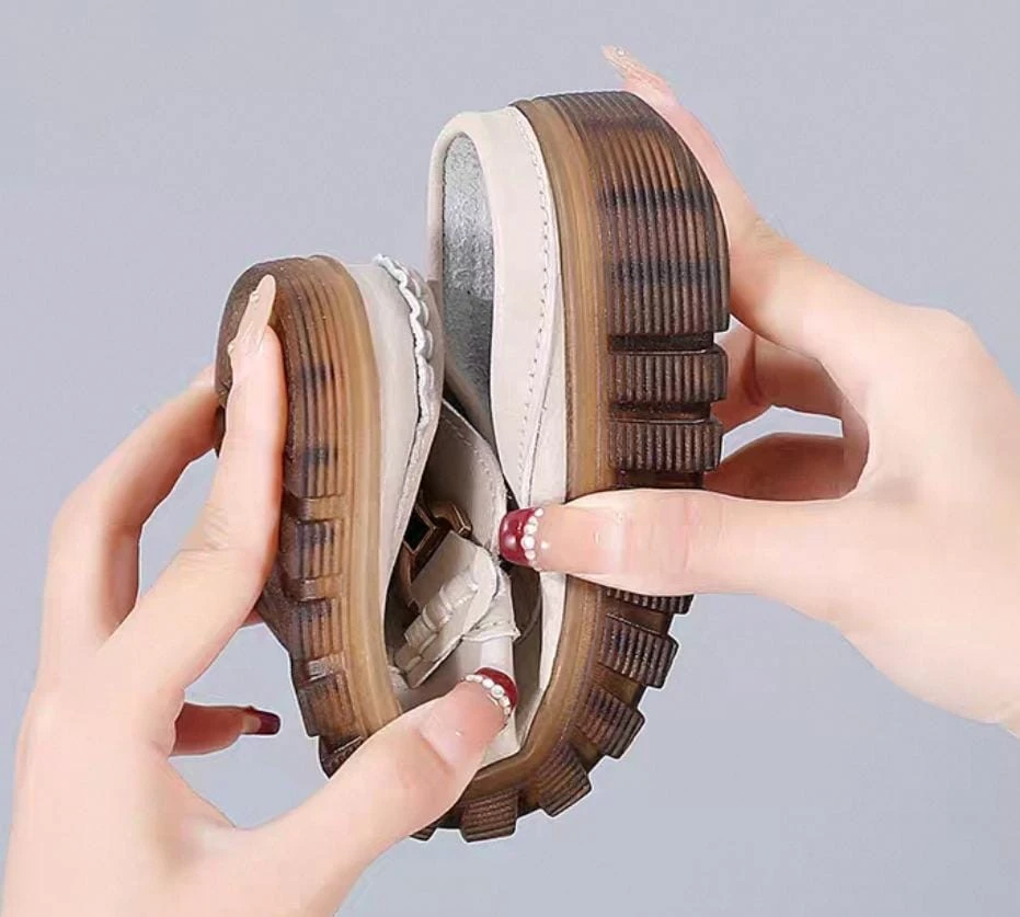 الاحذية مصنوعه من الجلد الصناعي مع نعل سميك ومتين يمنحها راحة أثناء المشي .