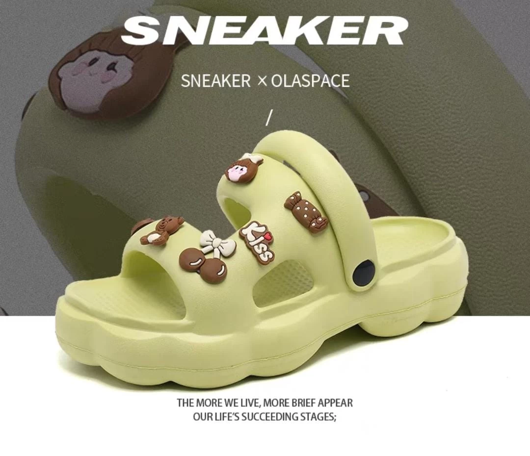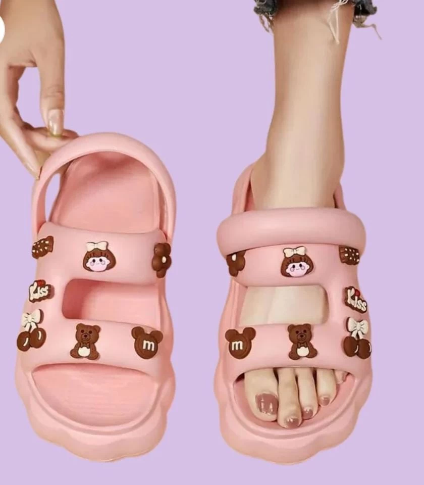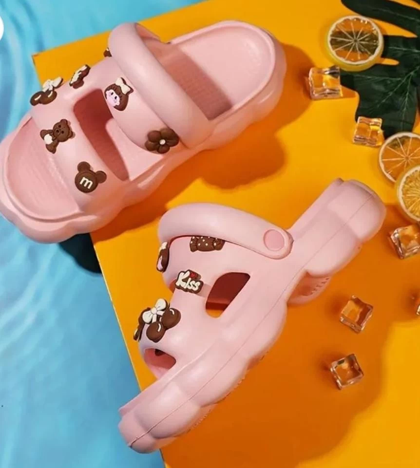 الحذاء مصنوع من مادة مطاطية خفيفة الوزن، مع تصميم مفتوح من الأمام وشريطين عريضين لضمان ثبات القدم.