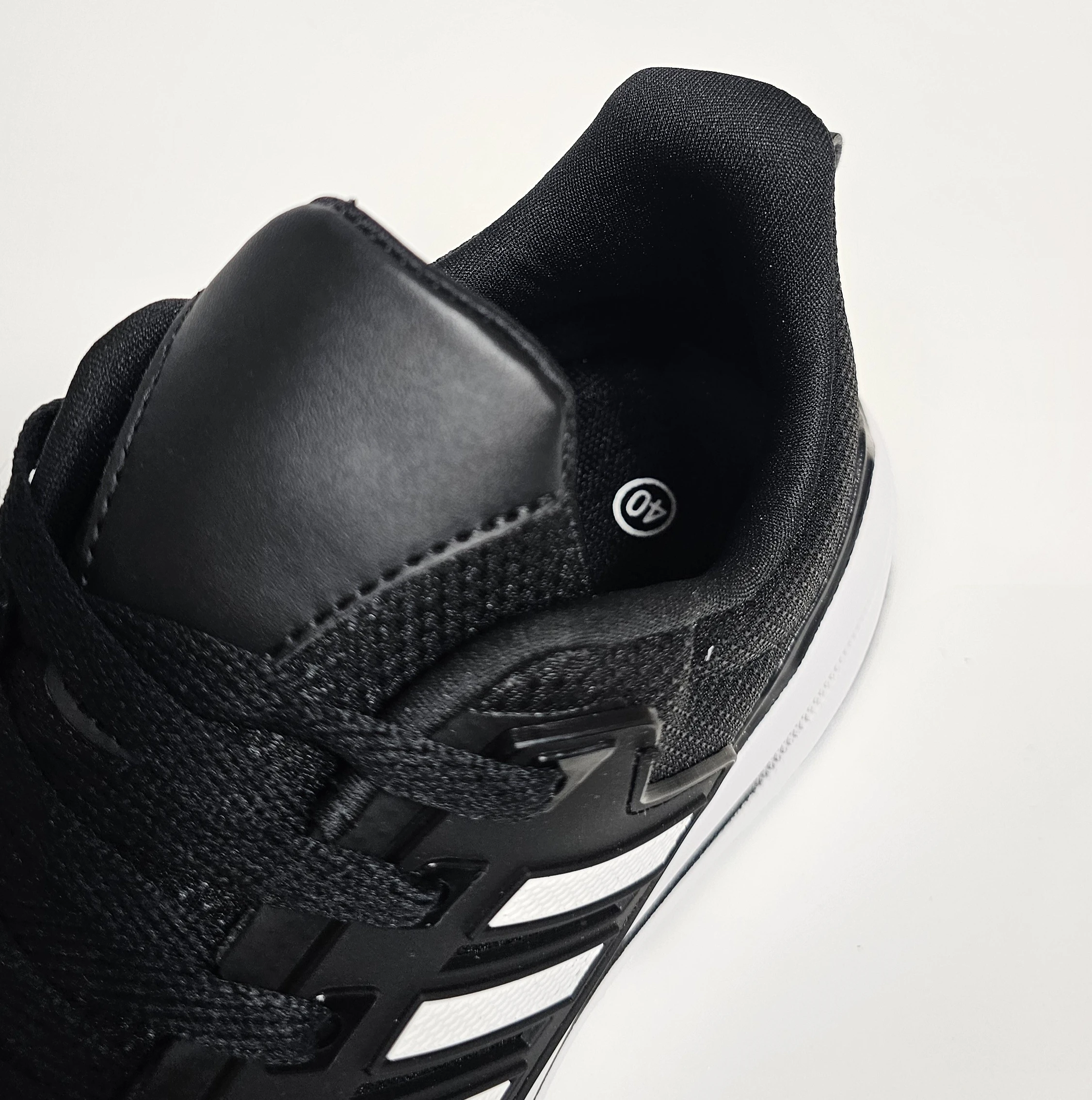 حذاء رياضي يتميز بلونه الأسود الأنيق مع تفاصيل خطوط بيضاء على الجوانب
