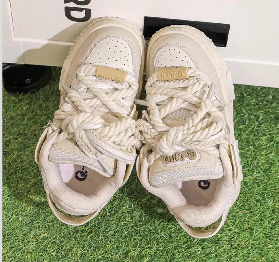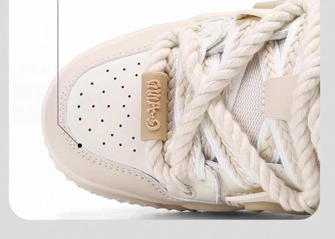 حذاء رياضي يجمع بين اللونين البيج والأبيض.