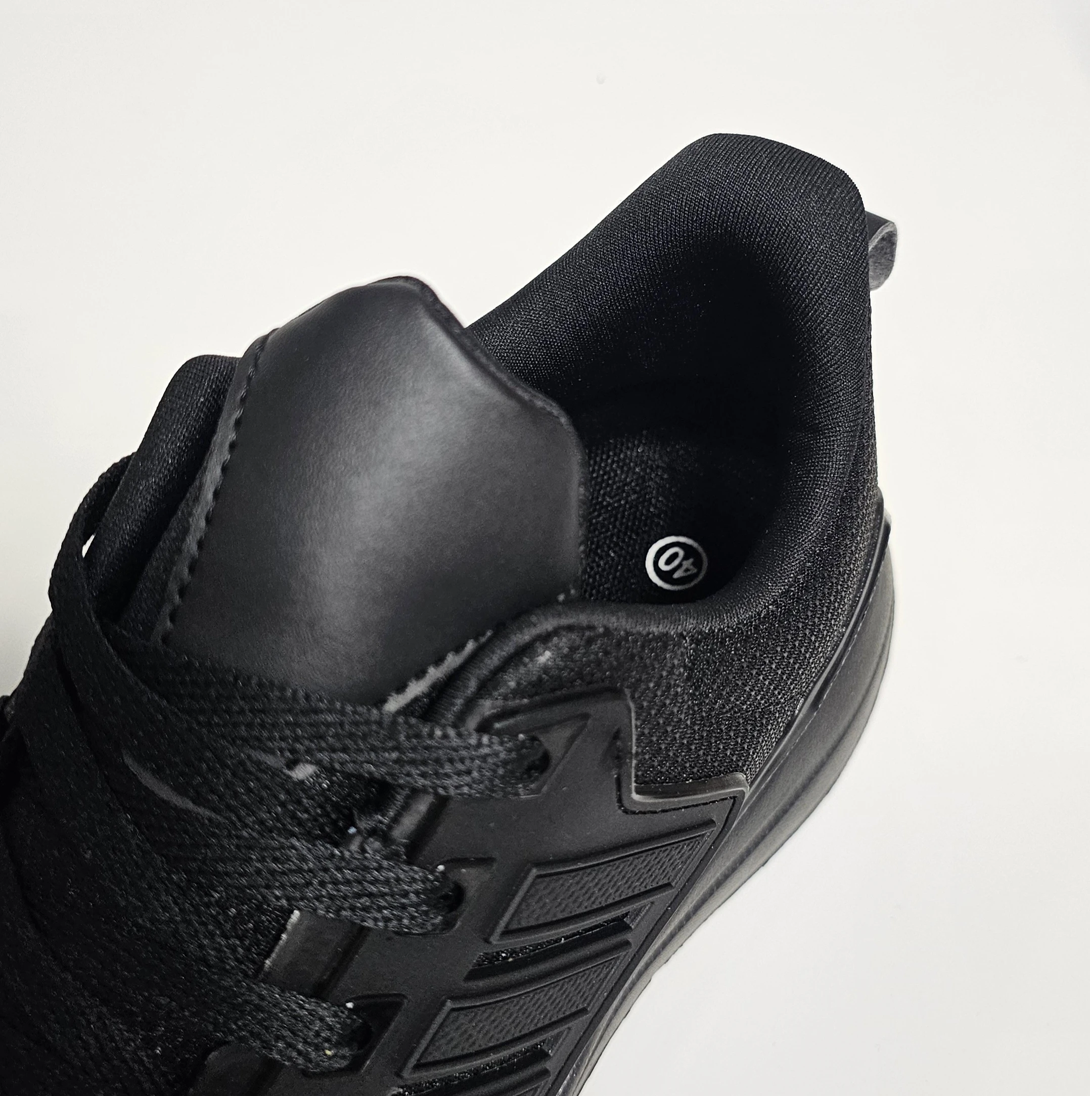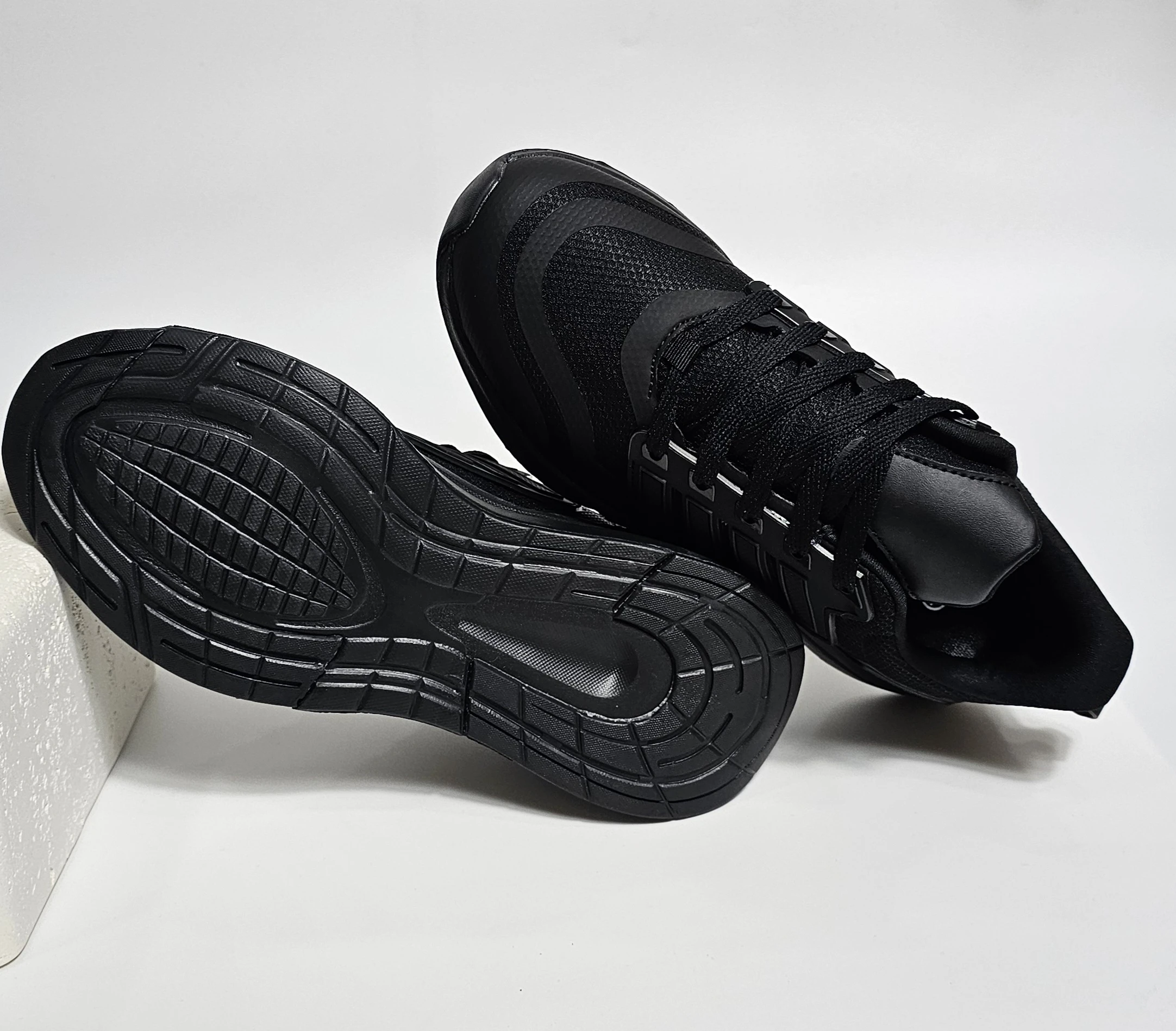 الحذاء الرياضي يتميز بتصميم أنيق وعصري بلون أسود بالكامل.