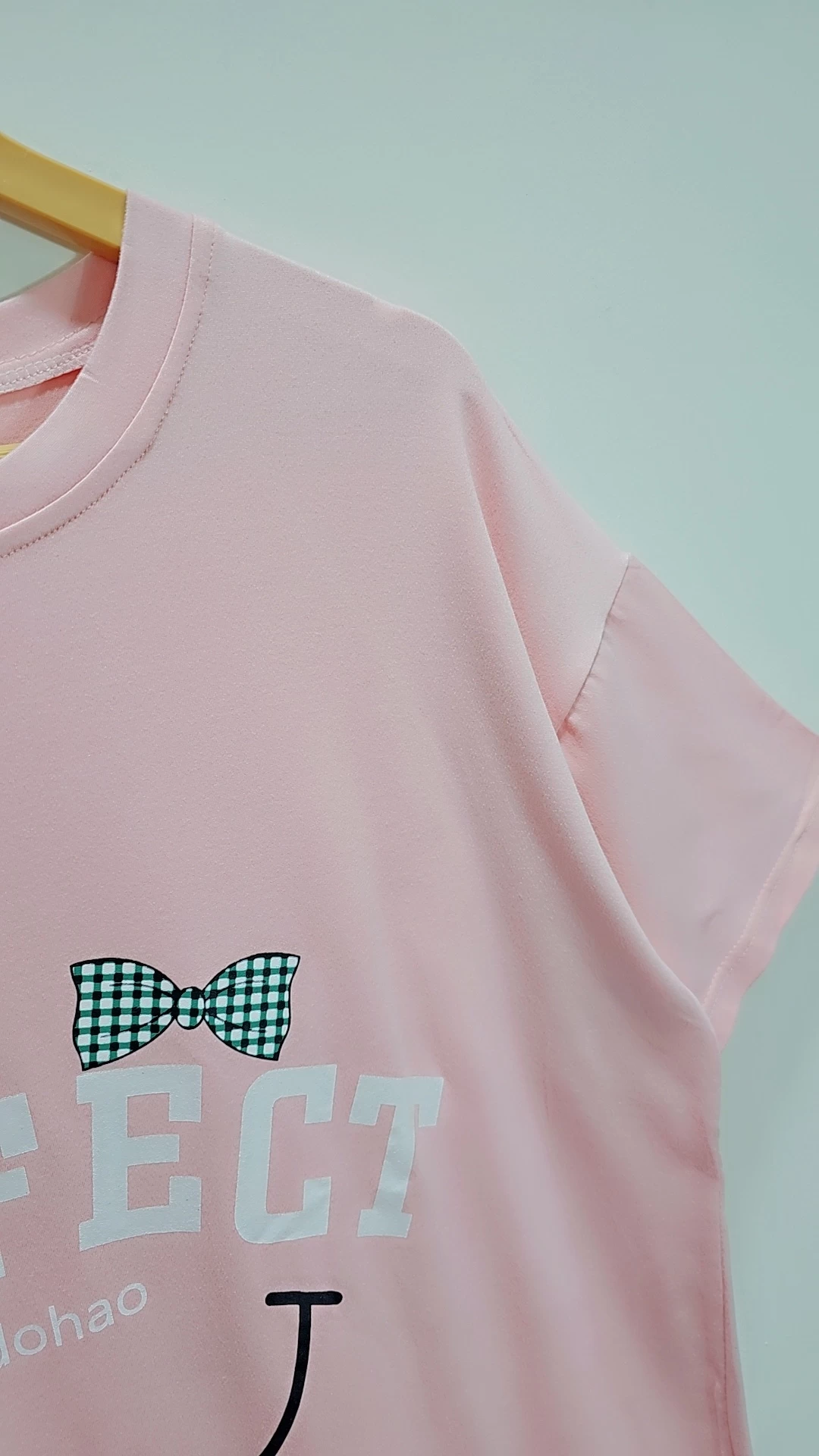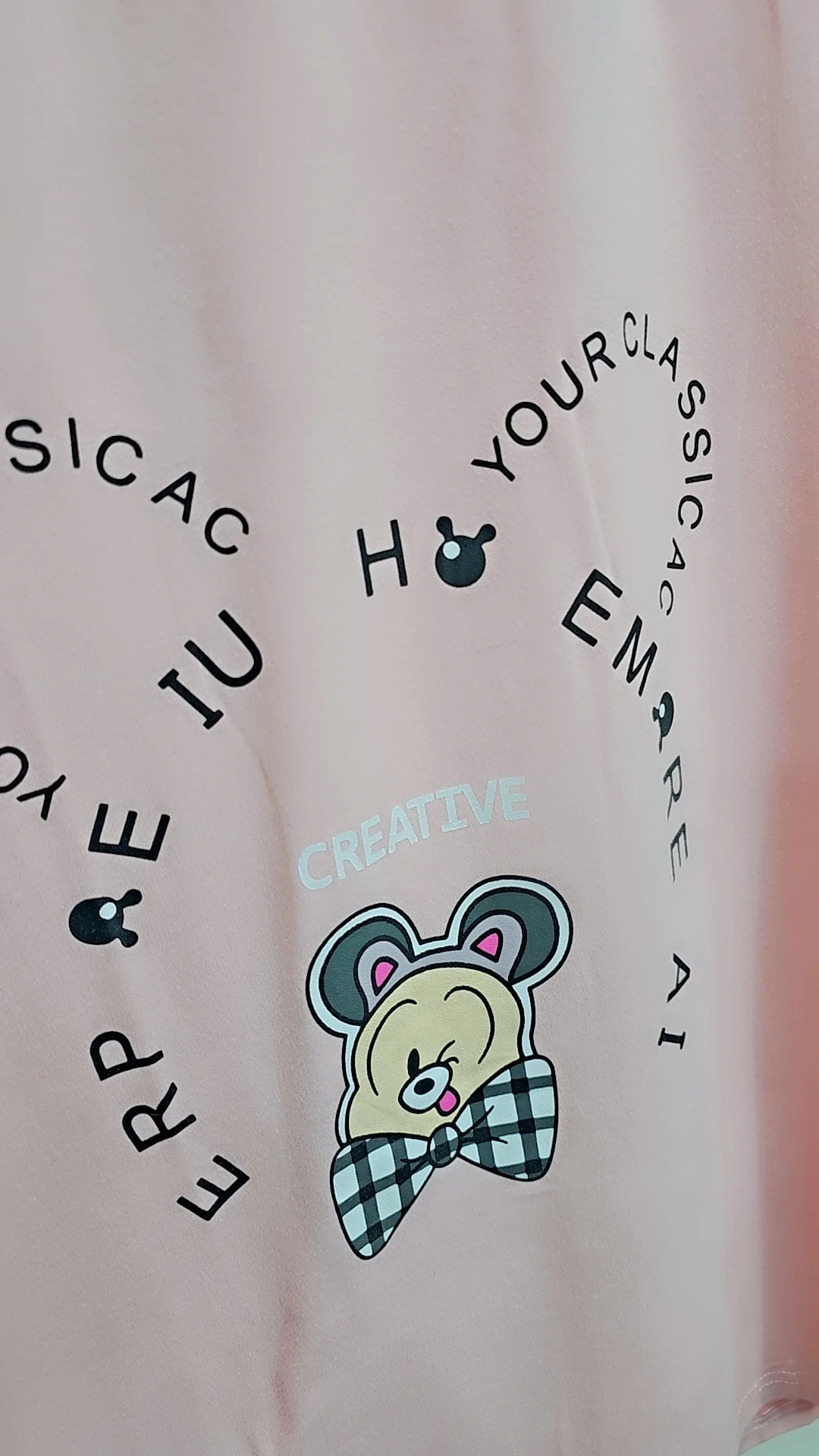 عبارة عن قميص نوم قصير فضفاض، بأكمام قصيرة، مع تصميم كرتوني لطيف.