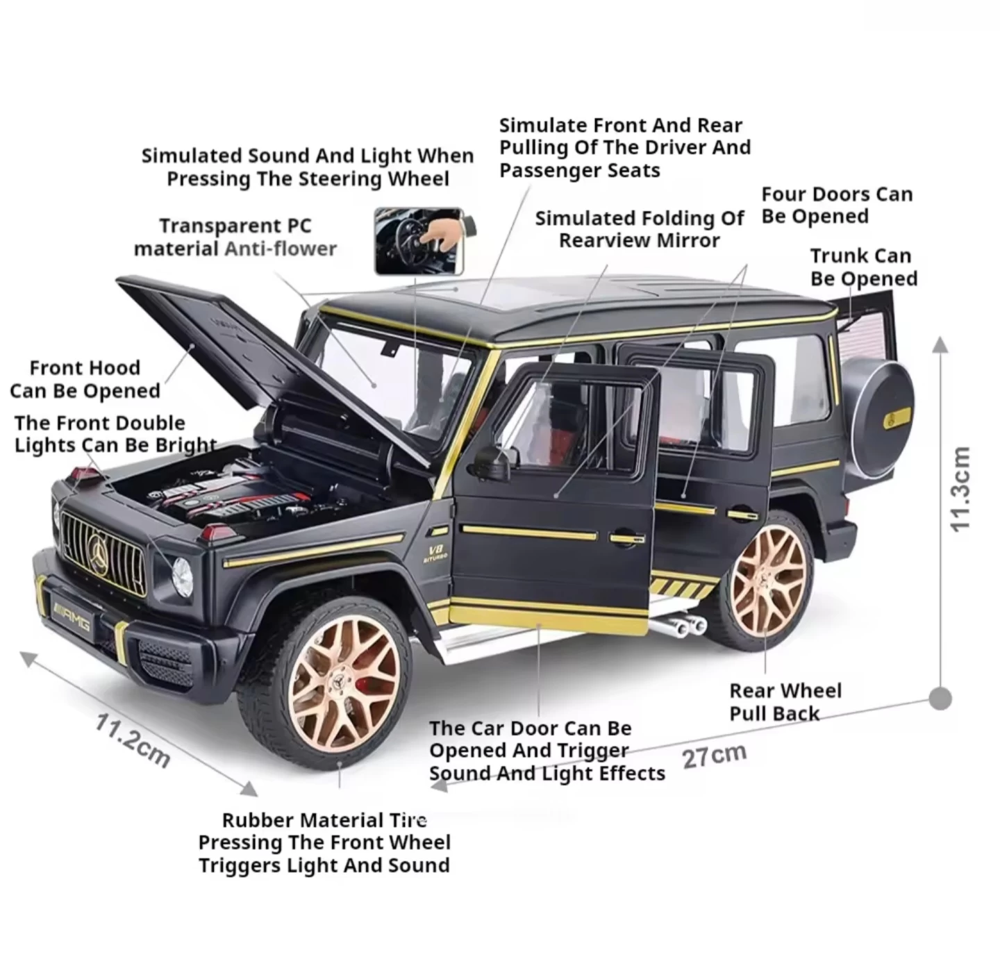 والجسم مصنوع من سبائك الزنك، والزجاج الأمامي والجزء الداخلي للسيارة مصنوع من مادة ABS الصديقة للبيئة،