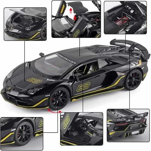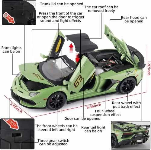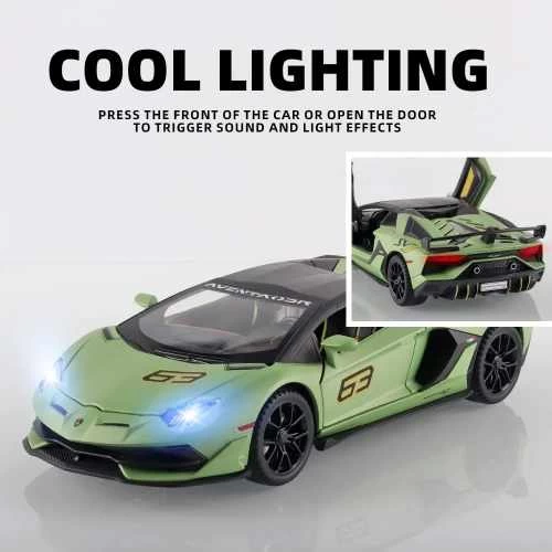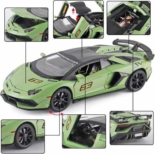 2. سيارات لعبة لامبورجيني SVJ 63 خضراء المادة: مصنوعة من مادة سبائك الزنك + بلاستيك ABS. هيكل سبائك الزنك والجزء الداخلي والشاسيه مصنوعان من بلاستيك ABS وإطارات مطاطية.