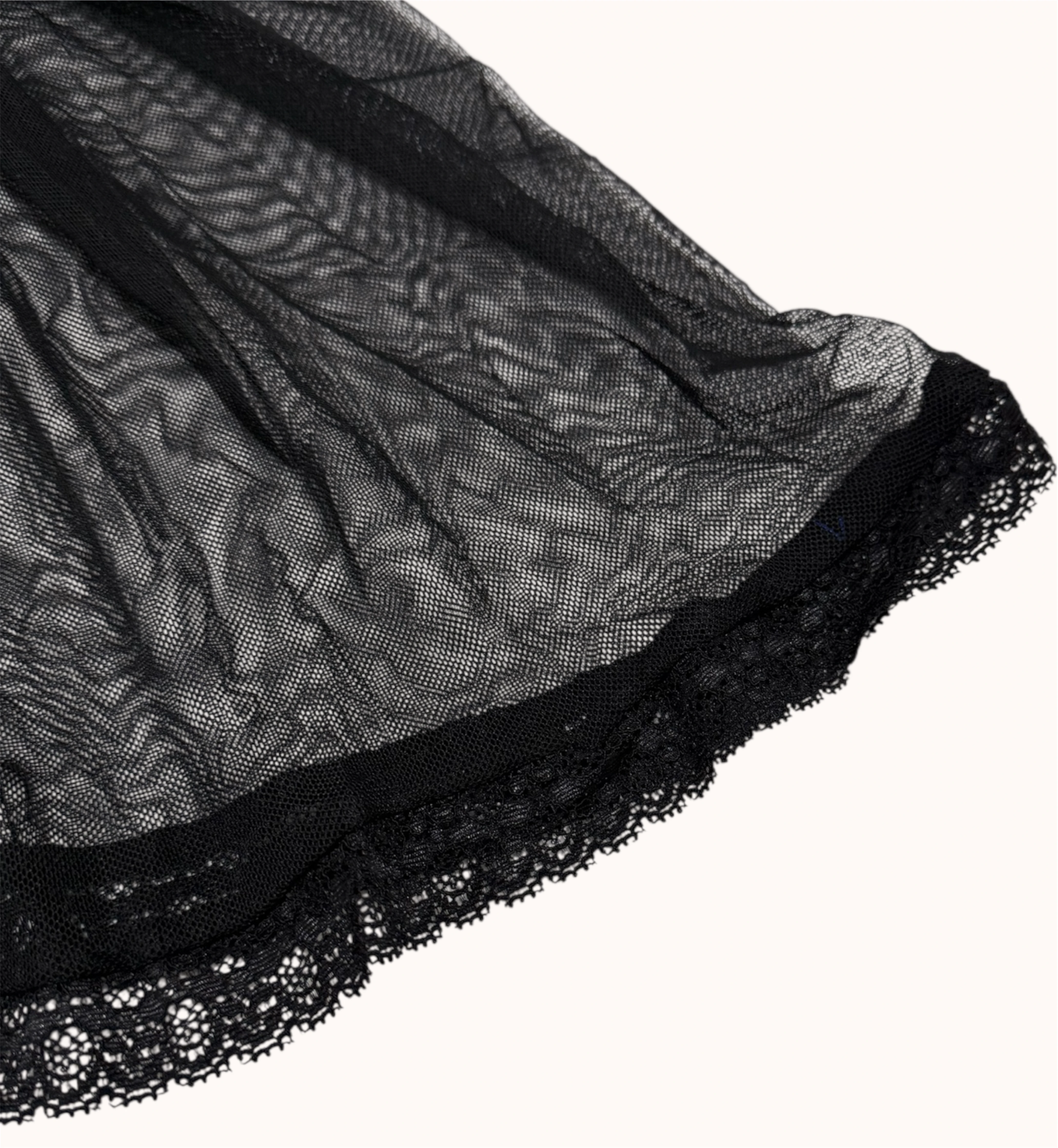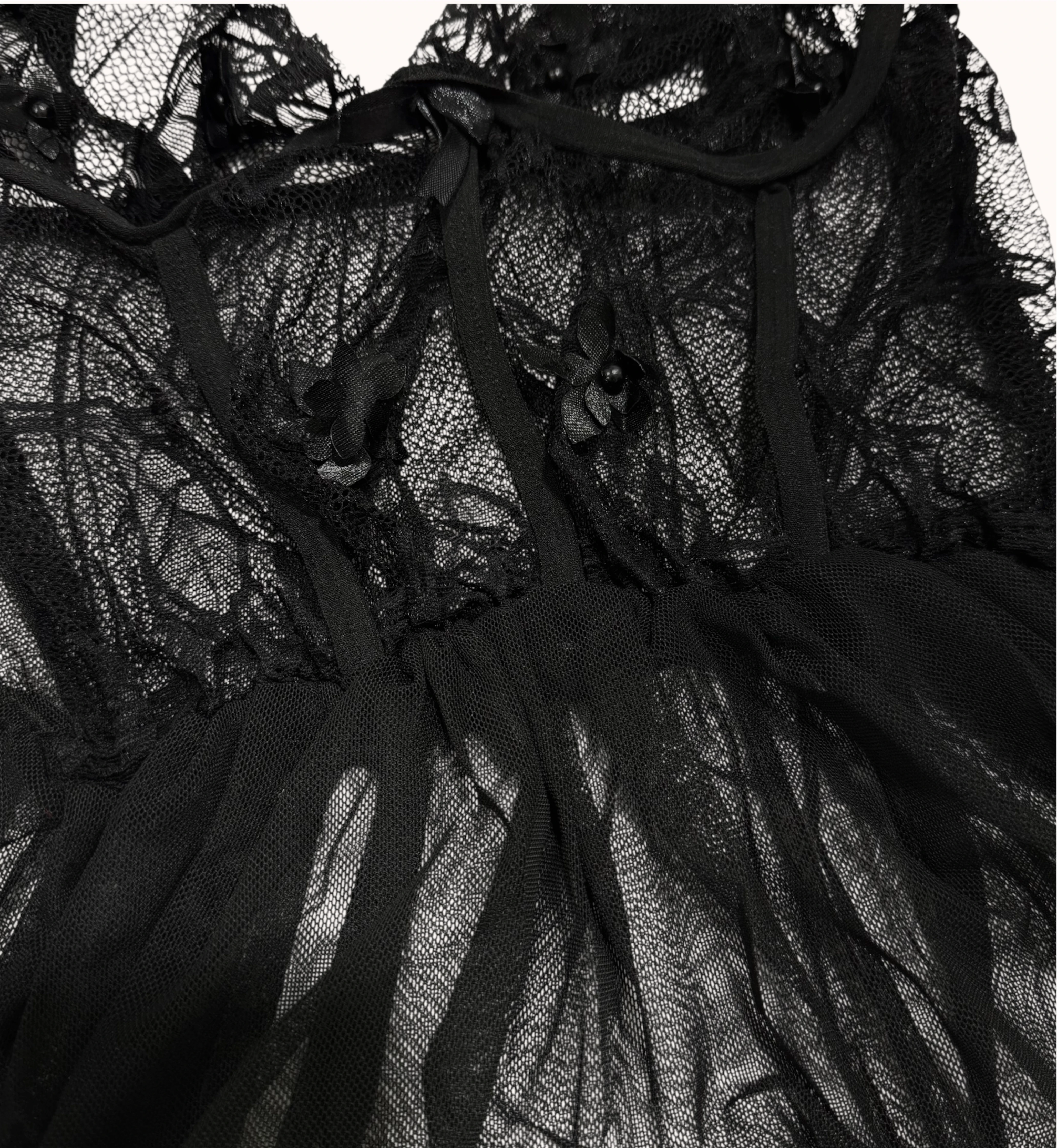 قطعة لانجري أنيقة تجمع بين الرقة والجرأة، مصممة لتبرز جمال القوام وتمنح إحساسًا بالأنوثة والثقة. تتكون من فستان قصير شفاف بتفاصيل دقيقة، مع سروال داخلي متناسق.