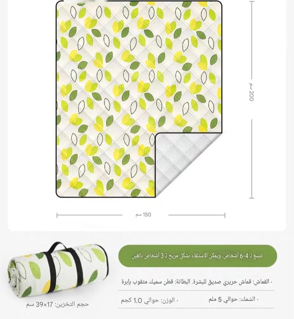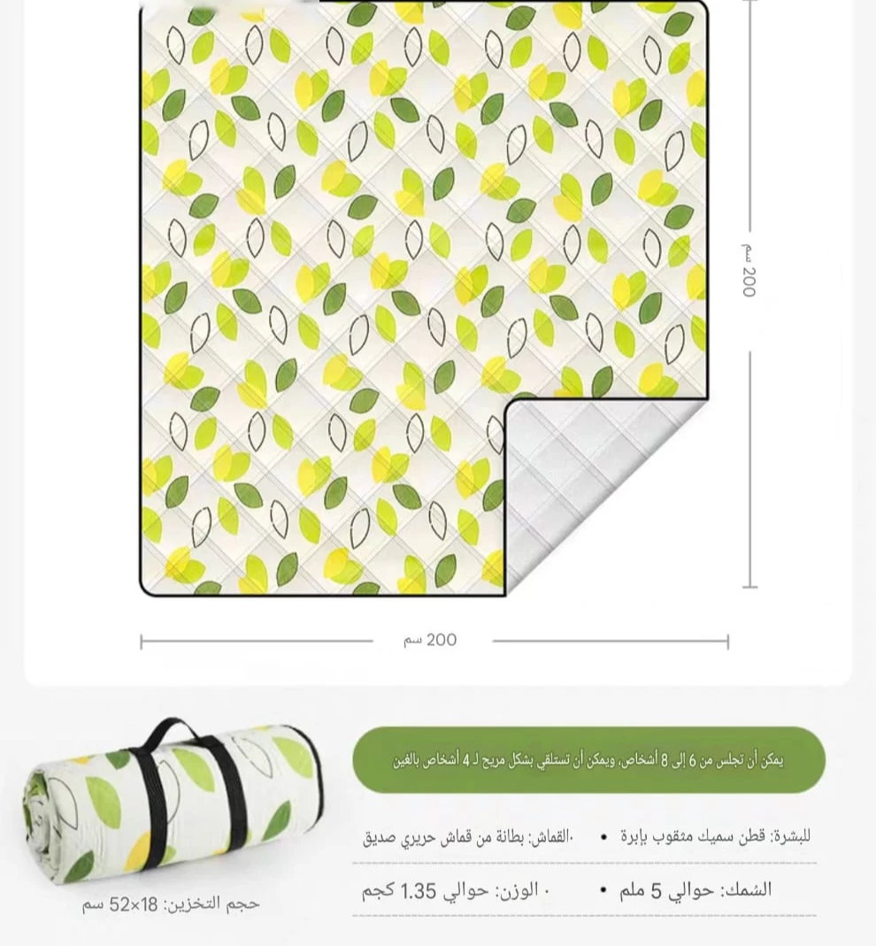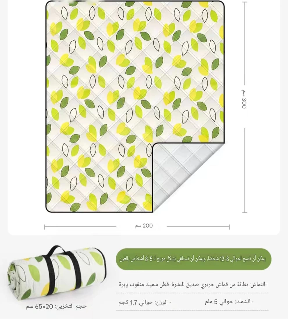 كبيرة الحجم، بأبعاد 200 سم × 300 سم، مزينة بنقوش أوراق شجر بألوان خضراء وصفراء. يمكن طيها وتخزينها بسهولة في حجم 65 سم × 20 سم. الحصيرة مصنوعة من قماش حريري صديق للبشرة وقطن سميك مثقوب. سمك الحصيرة حوالي 5 ملم، ووزنها حوالي 1.7 كجم. يمكن أن تتسع لحوالي 12-8 شخصًا، وتتيح الجلوس بشكل مريح لـ 5-8 أشخاص.