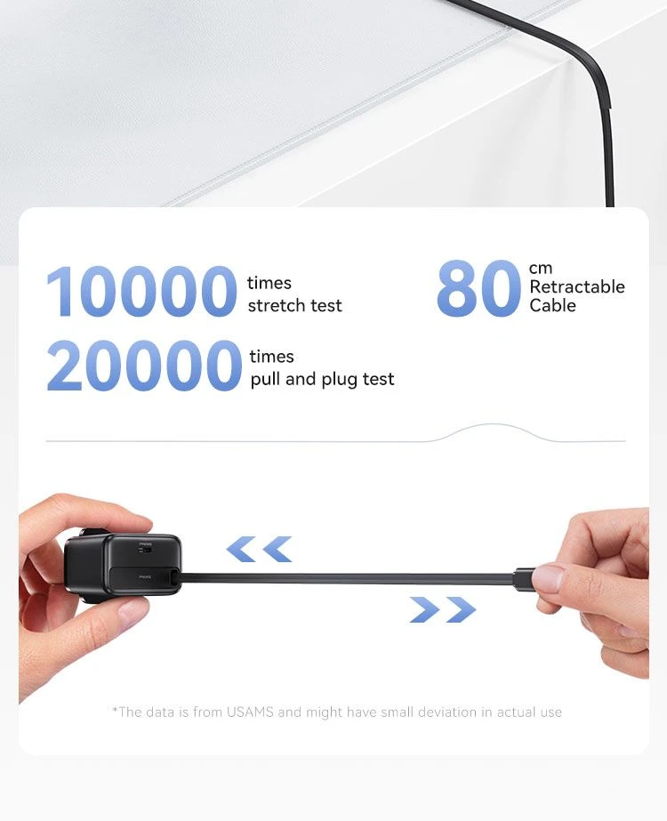 يأتي الشاحن بتصميم مدمج وعصري، مزود بكابل Type-C قابل للسحب بطول يصل إلى 80 سم،