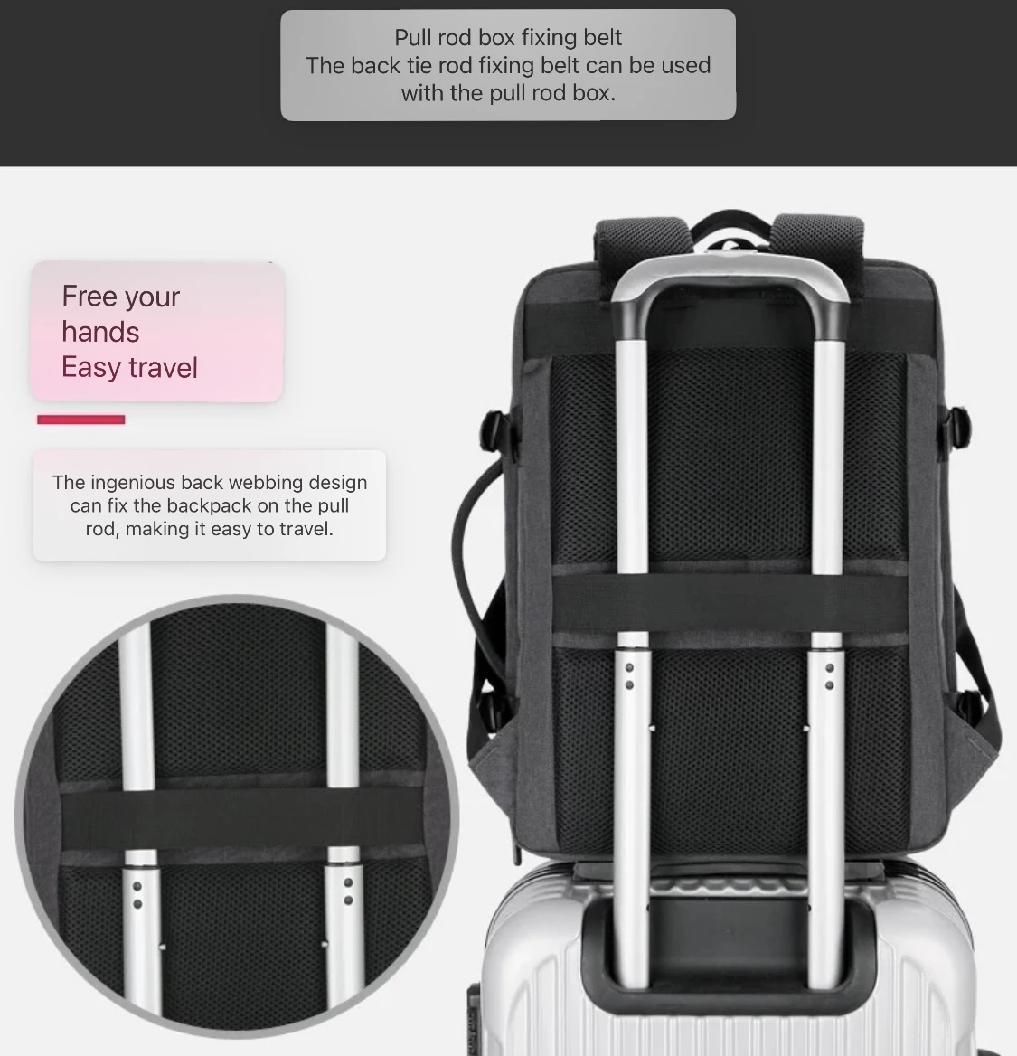 - 🧷 التثبيت: حزام خلفي لتثبيت الحقيبة على حقيبة السفر