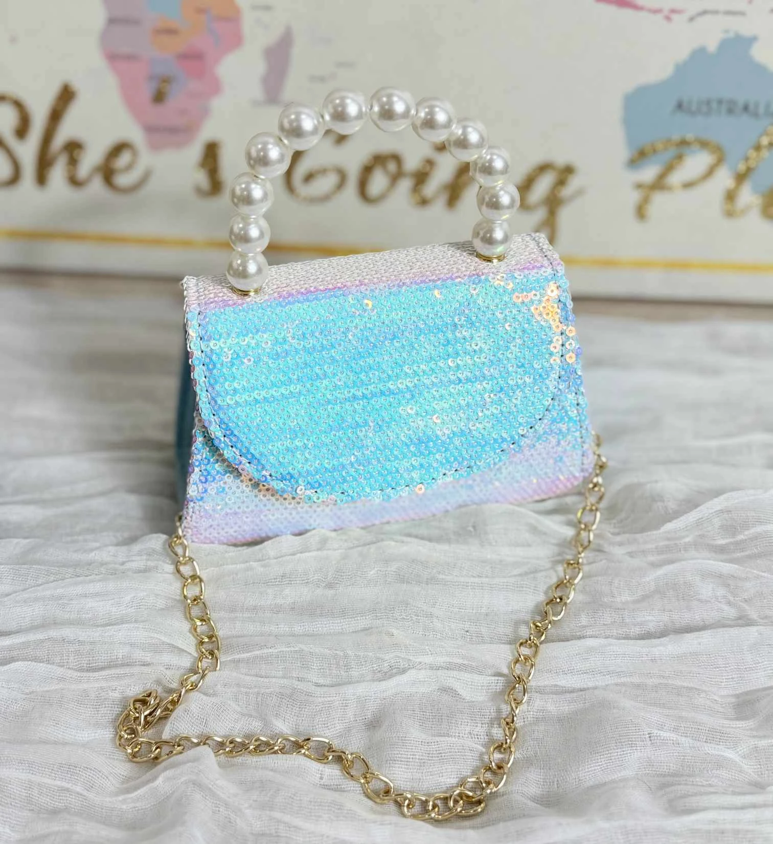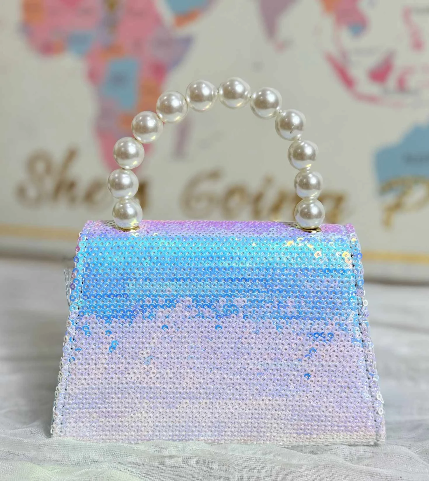 شنطه بنات بالوان عديده مزينه بالترتر وبمسكه لولو
