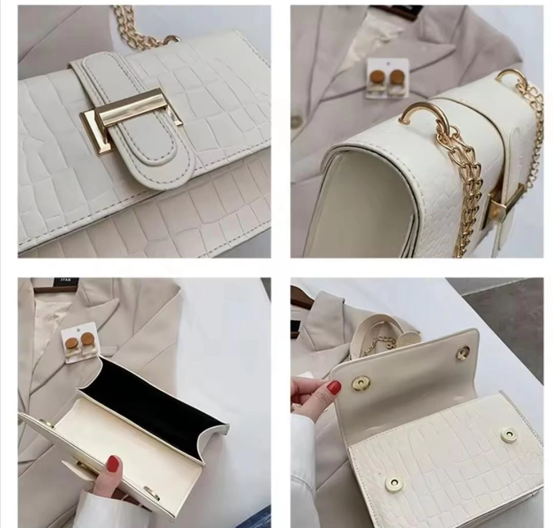 1. تصميم عصري وفاخر: نقشة جلد التمساح مع حزام سلسلة ذهبي.