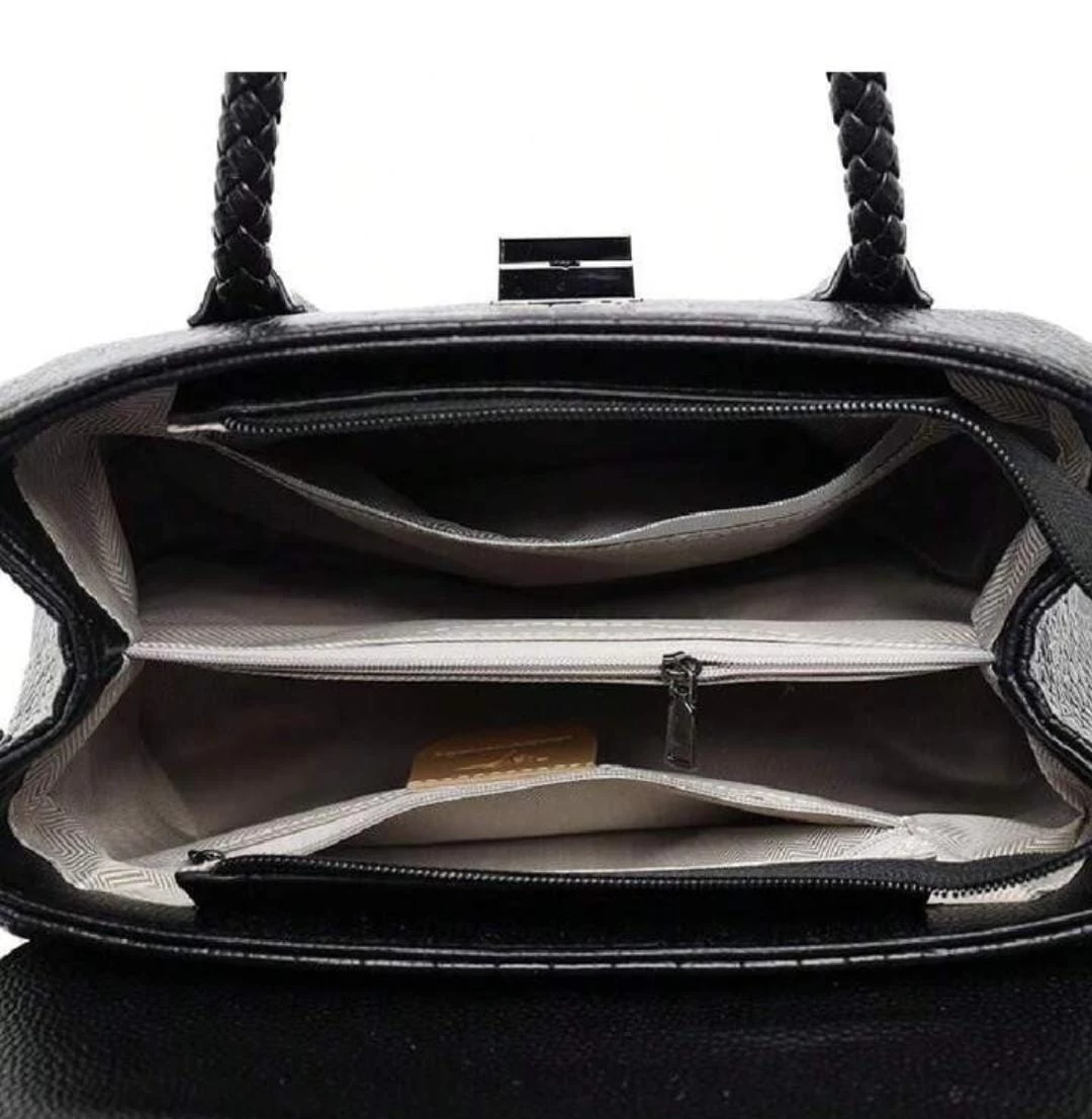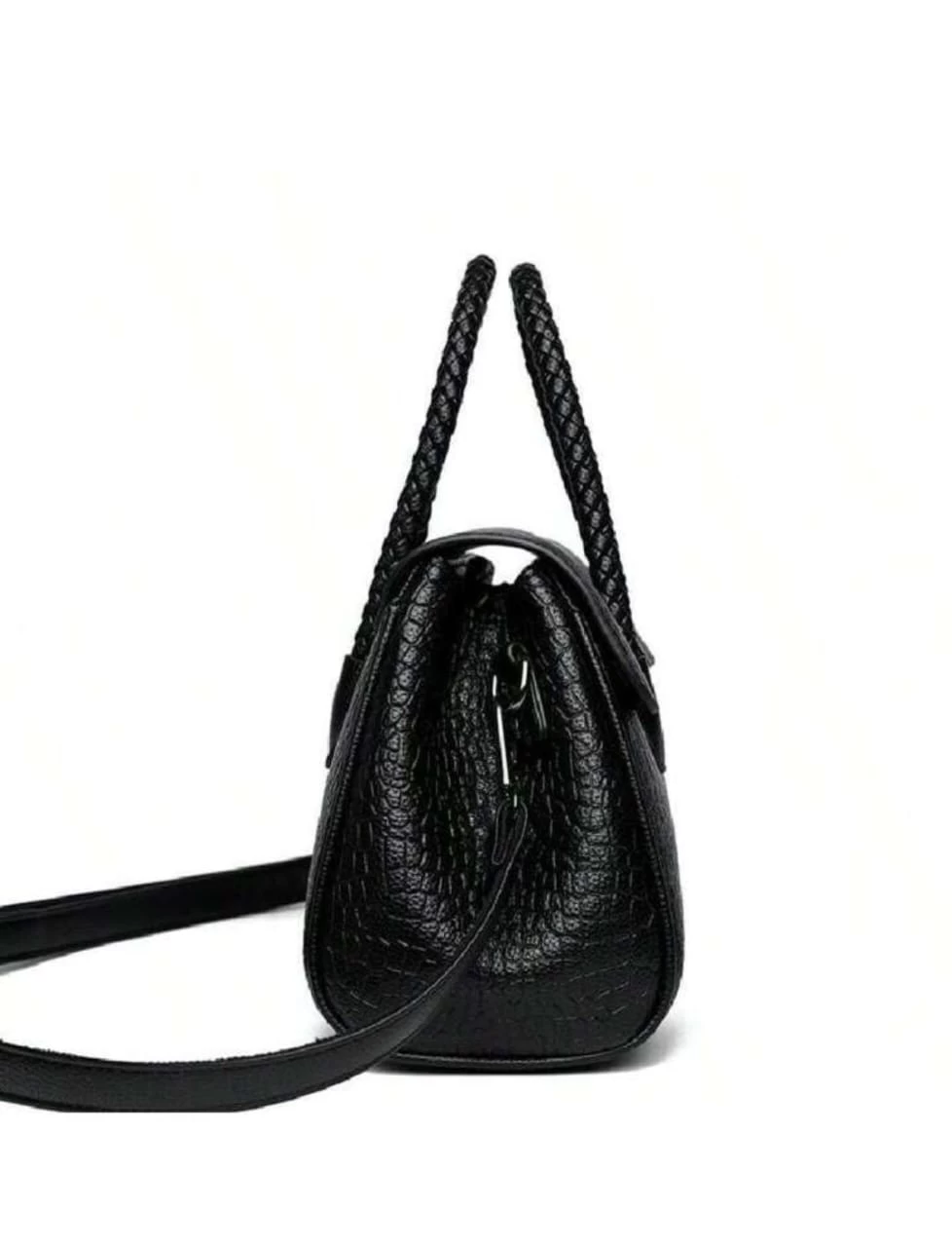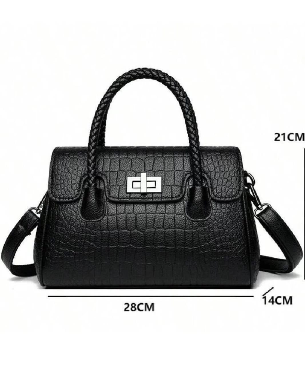 “شنطة يد كلاسيكية جلد بنقشة التمساح.” 1. الخامة: جلد صناعي عالي الجودة بنقشة فاخرة. 2. التصميم: يد علوية مضفرة مع حزام كتف قابل للإزالة. 3. الإغلاق: قفل معدني عصري. 4. الحجم: متوسط، مناسب لحمل الضروريات اليومية. 5. التفاصيل: تصميم يجمع بين الكلاسيكية والعصرية. مناسبة للاستخدام اليومي في العمل أو الاجتماعات الرسمية. مثالية للمناسبات شبه الرسمية مثل العشاء أو التسوق الفاخر. تناسب إطلالات الشتاء والخريف بفضل تصميمها وألوانها الراقية.