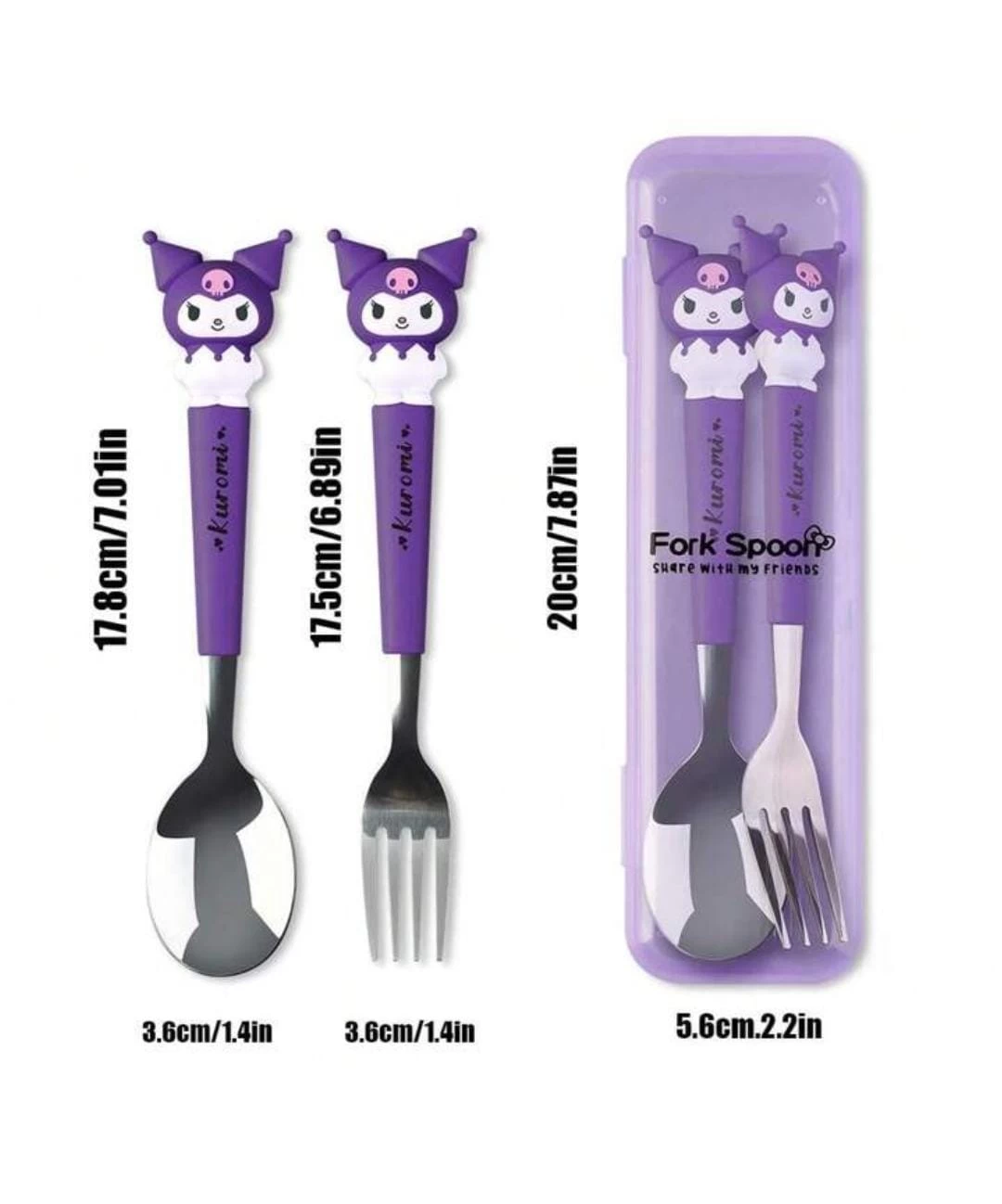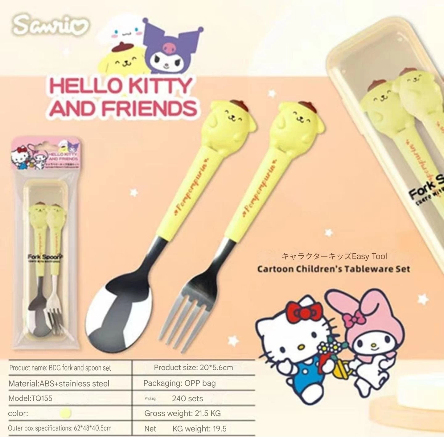 خمس مجموعات من أدوات تناول الطعام للأطفال، كل مجموعة تتكون من ملعقة وشوكة، مُوضوعة في علب بلاستيكية منفصلة. كل مجموعة تحتوي على تصميم لشخصيات مختلفة على مقابض الأدوات. العلب تأتي بألوان مختلفة: أرجواني، أزرق، وردي، وأزرق فاتح. الشخصيات على المقابض ملونة وتبدو وكأنها من سلسلة رسوم متحركة أو كارتون شهيرة. النصوص على المقابض والعلب تتضمن عبارات مثل "My Melody"، "Kuromi"، و "Fork Spoon Cute with my friends".