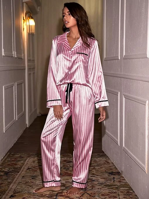 طقم بيجامة ساتان مخطط للنساء مكون من قطعتين باكمام طويلة وسروال بازرار سفلية