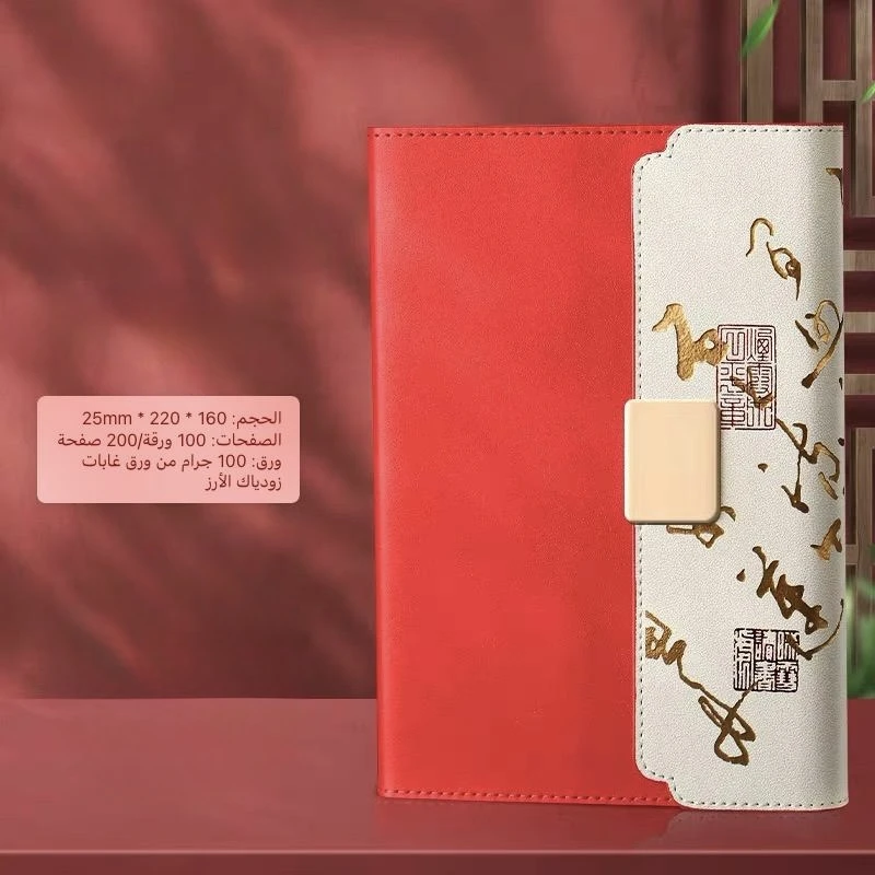 جهة حمراء أنيقة وجهة بيضاء مزينة بزخارف ذهبية وختمات فنية مستوحاة من الطابع الصيني.