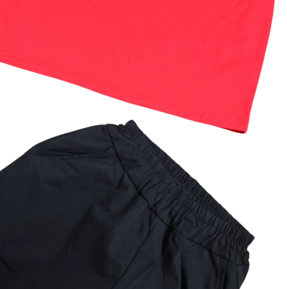 طقم مكونًا من قميص أحمر وسروال أسود.