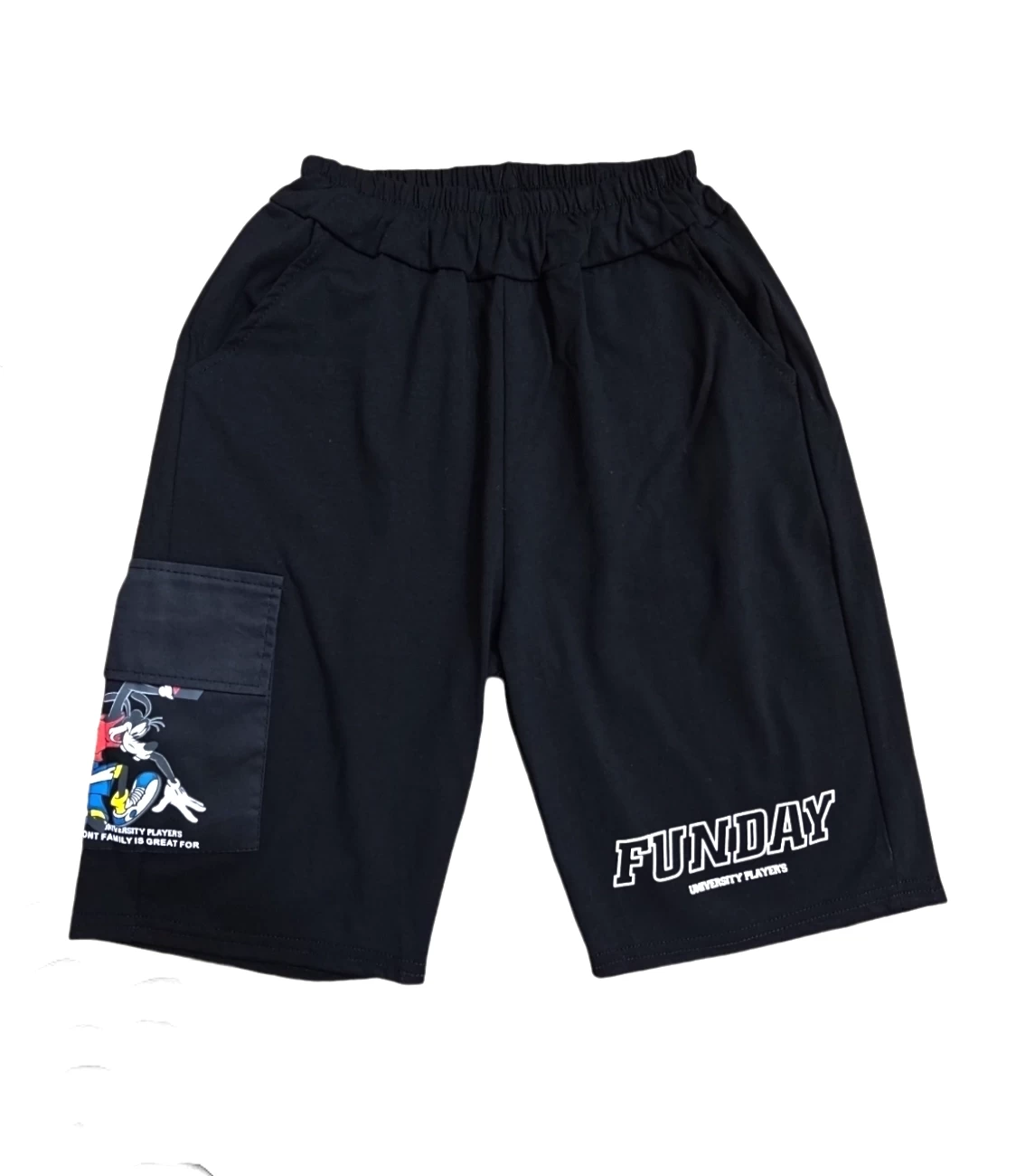السروال الأسود يحتوي على جيب جانبي عليه صورة لشخصية كرتونية أخرى،
