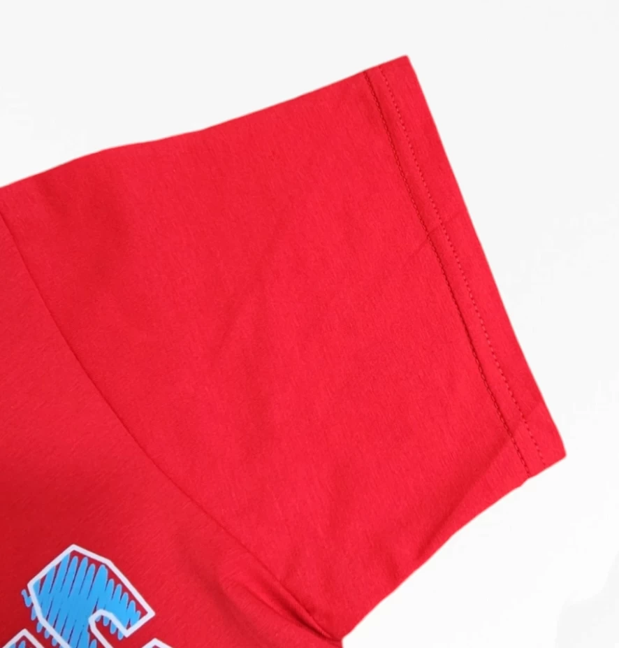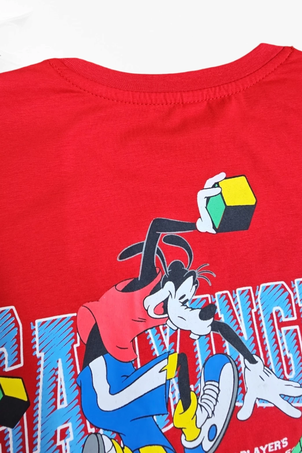 القميص الأحمر يحتوي على صورة لشخصية كرتونية مشهورة ترتدي قبعة خضراء،