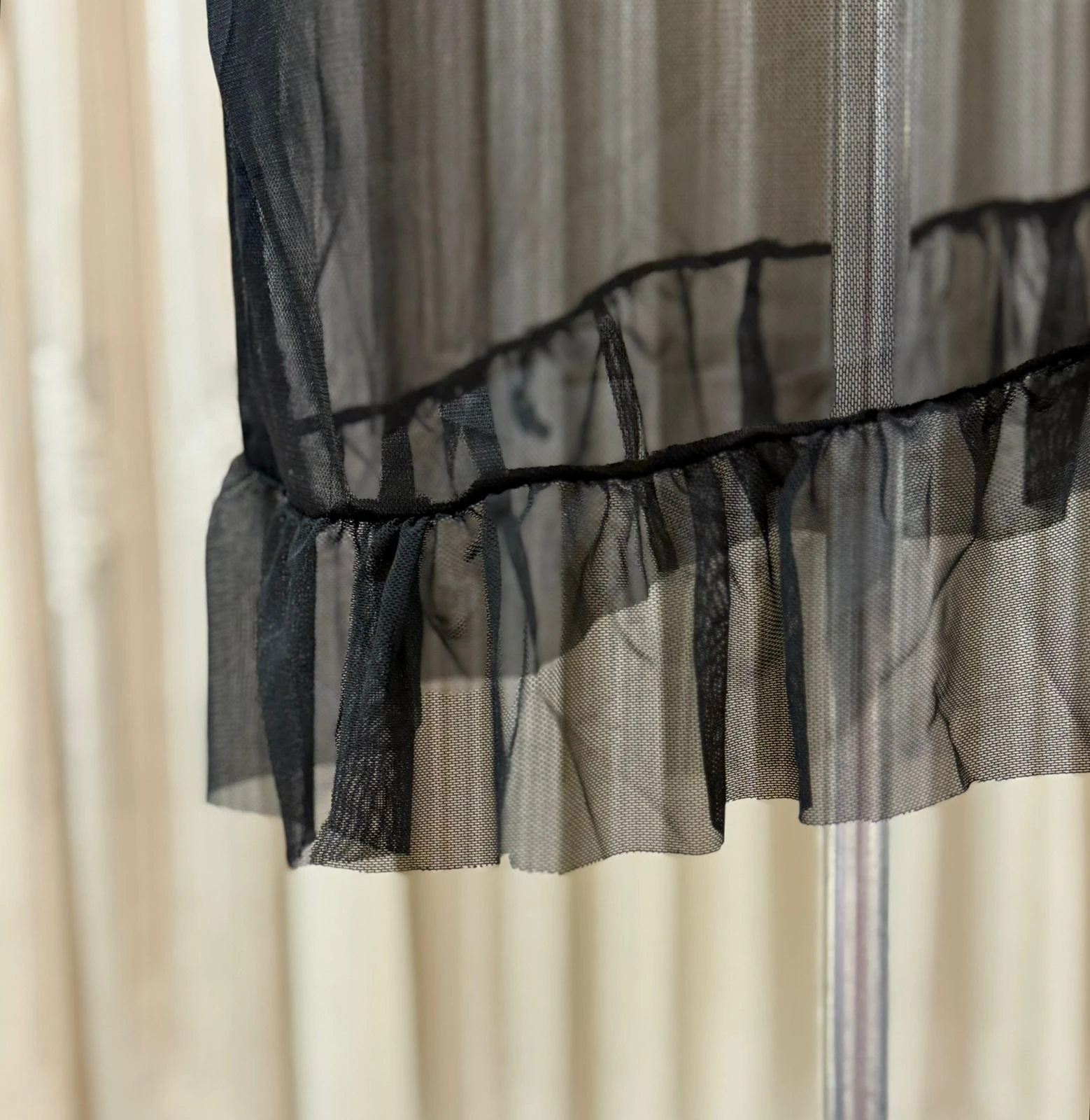 - القماش: دانتيل زهور فاخر + شبك شفاف (Mesh)
