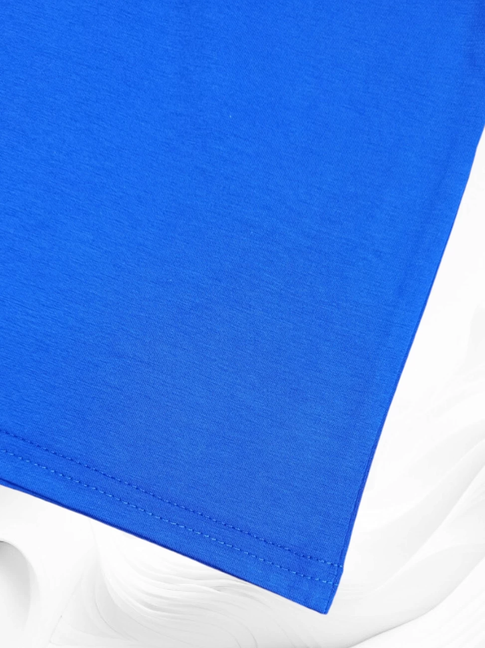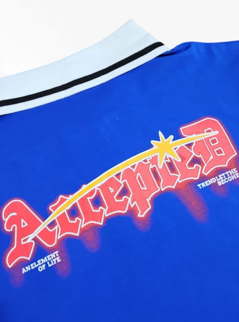 الطقم يتكون من قميص بولو أزرق وسروال قصير أسود.