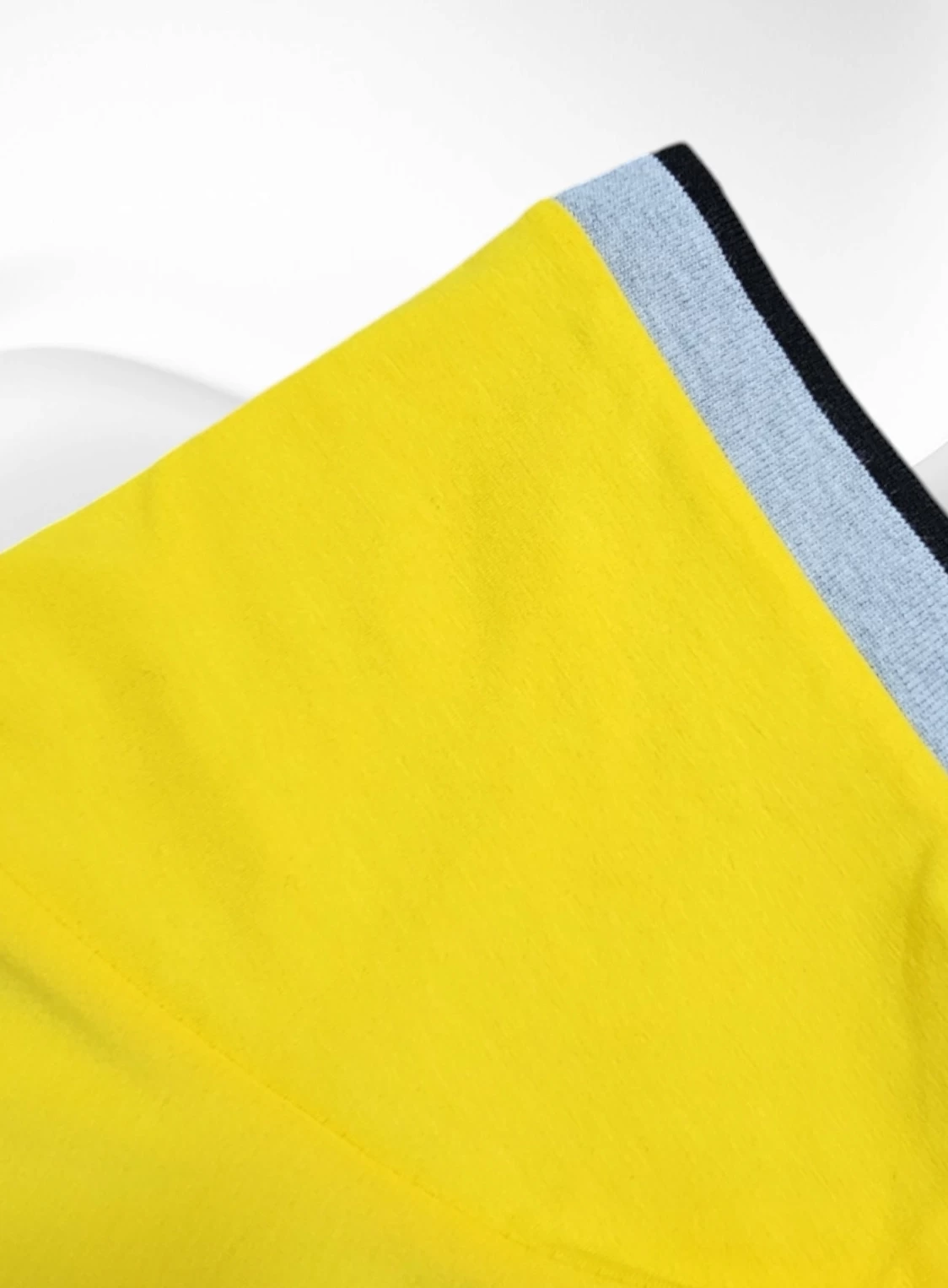 الطقم يتكون من قميص أصفر بأكمام قصيرة وسروال قصير أسود.