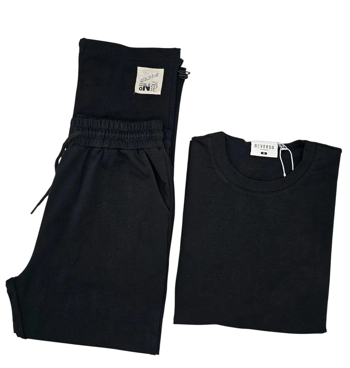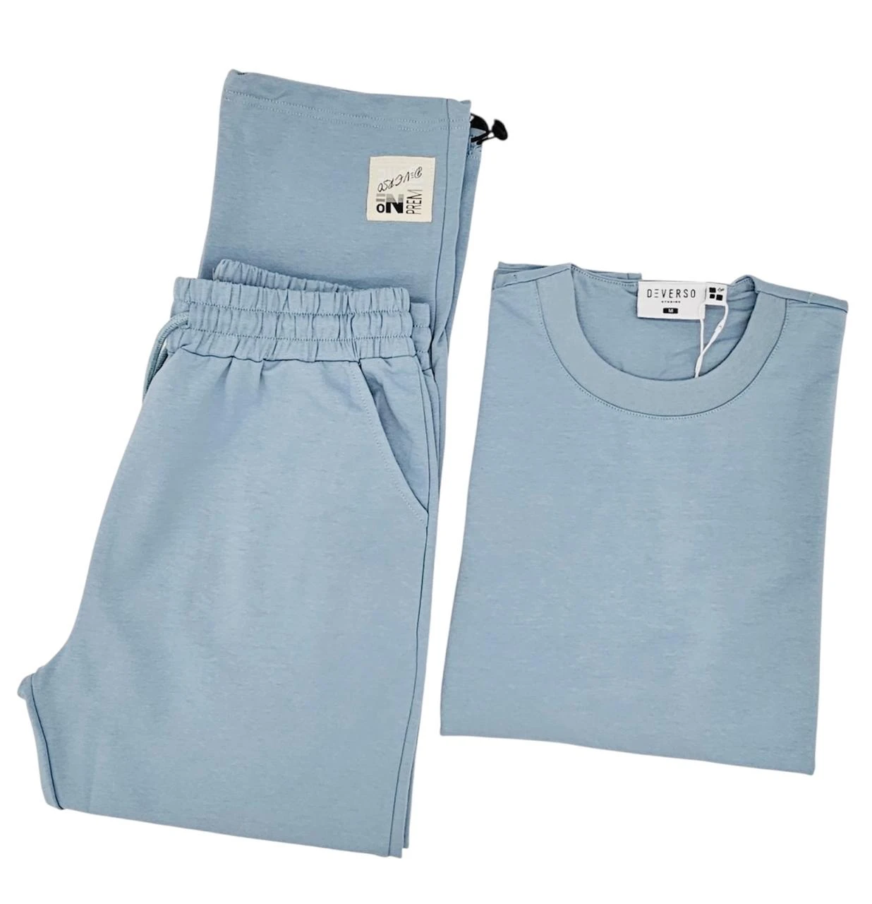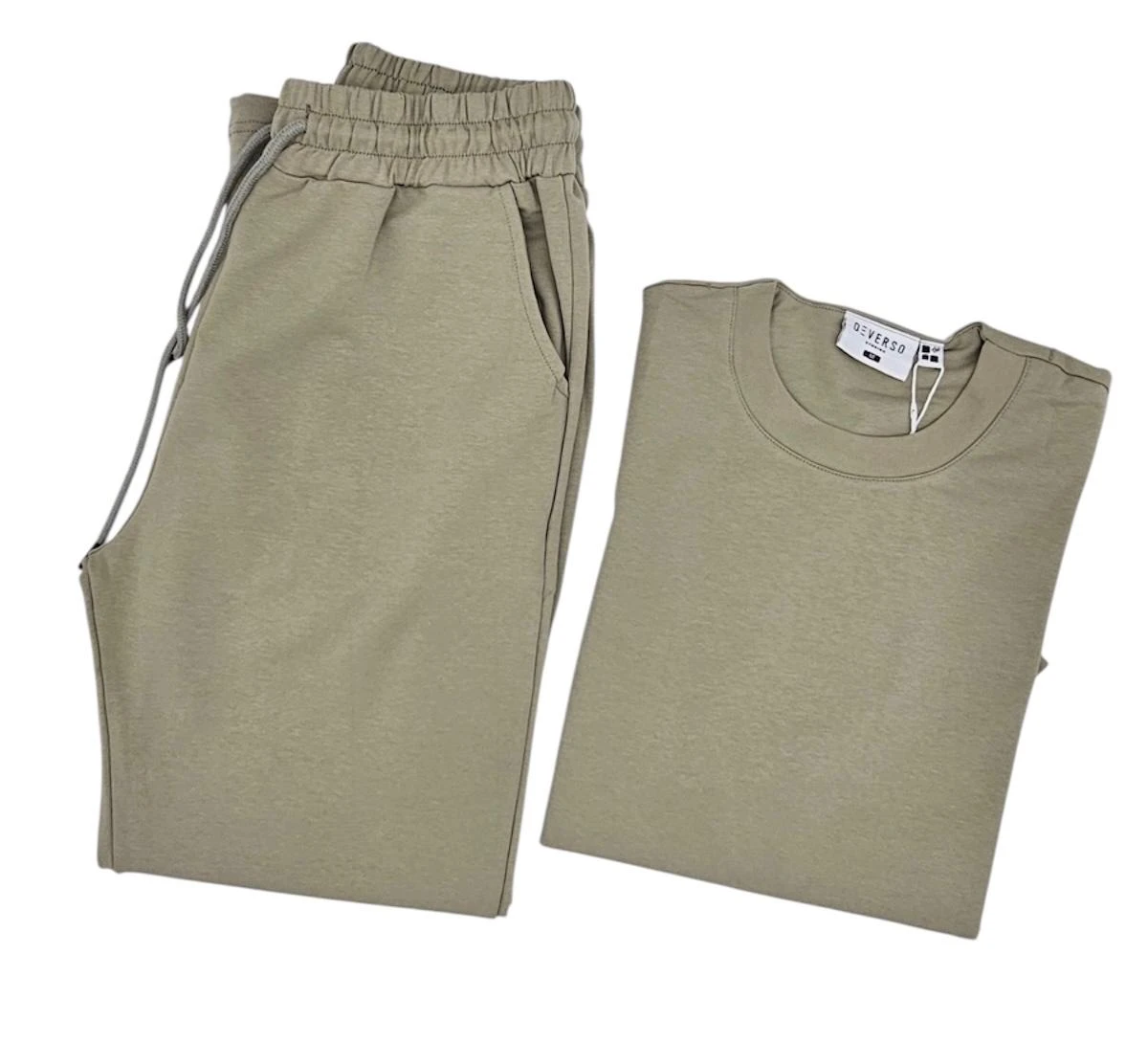 الطقم يتكون من بنطلون وتيشرت بلون موحد