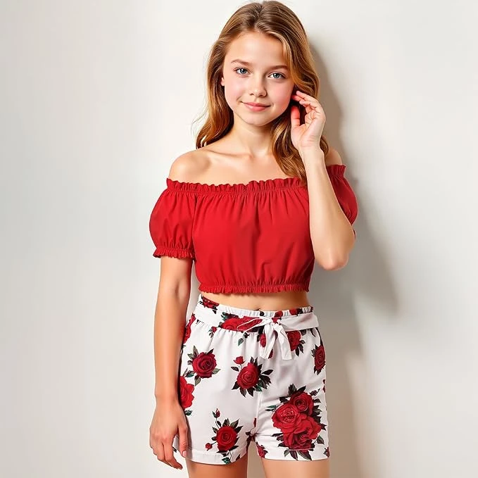 • 【بلوزة قصيرة محتشمة مع رقبة مكشكشة】 بلوزة مكشوفة الكتفين بأكمام منفوخة وخط رقبة قابلة للتمدد تضمن مظهرًا متواضعًا وأنيقًا، مثالية للفتيات من 8 إلى 12 سنة.