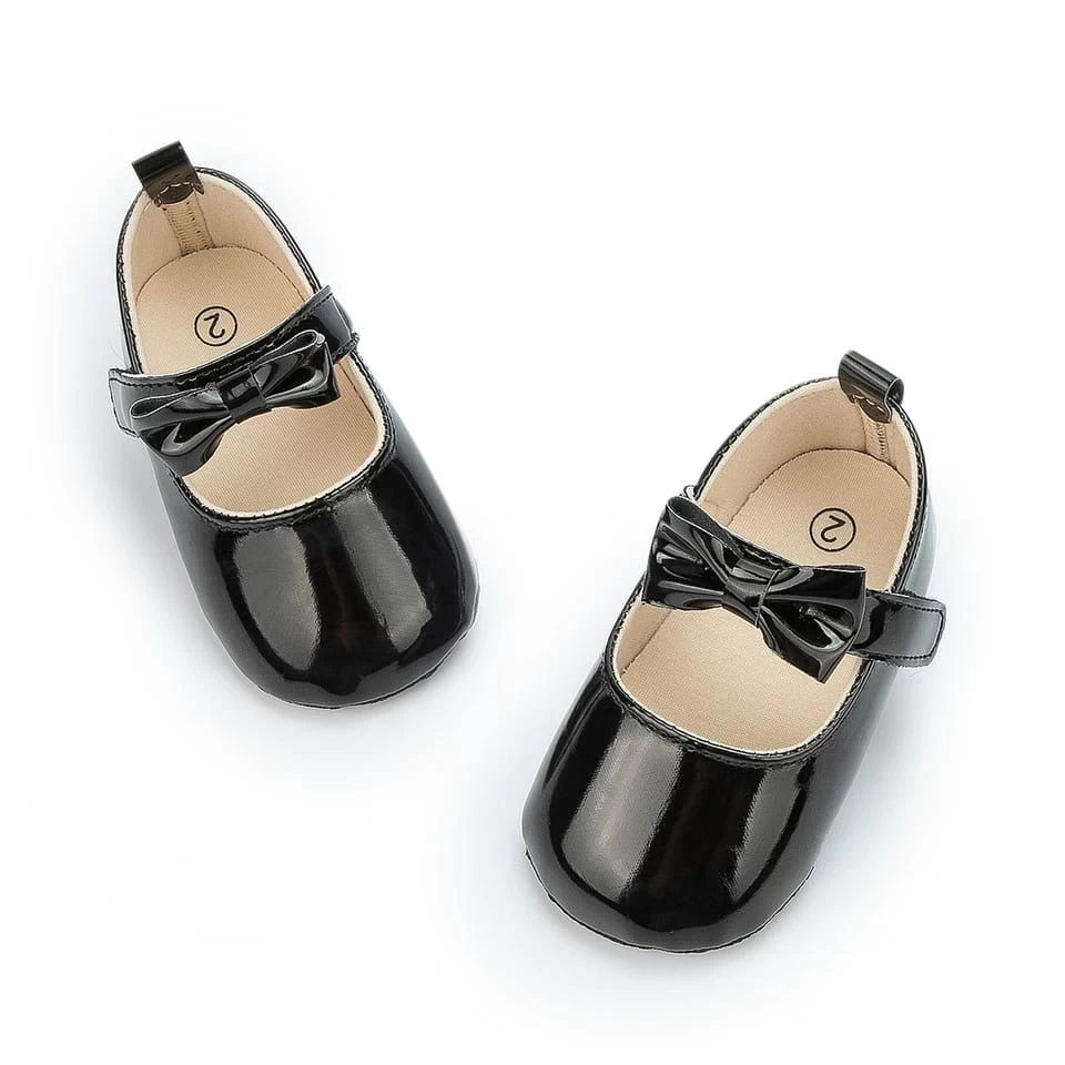 حذاء انيق لامع بفيونكه للبنات المواليد باللون الاسود