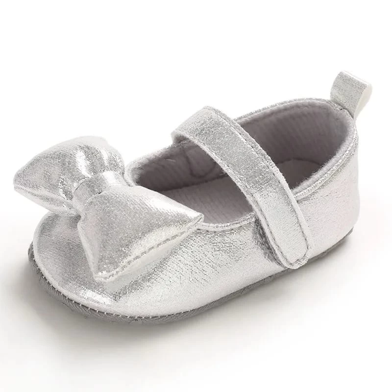 حذاء بنت رضيعه بفيونكه باللون الذهبي والفضي