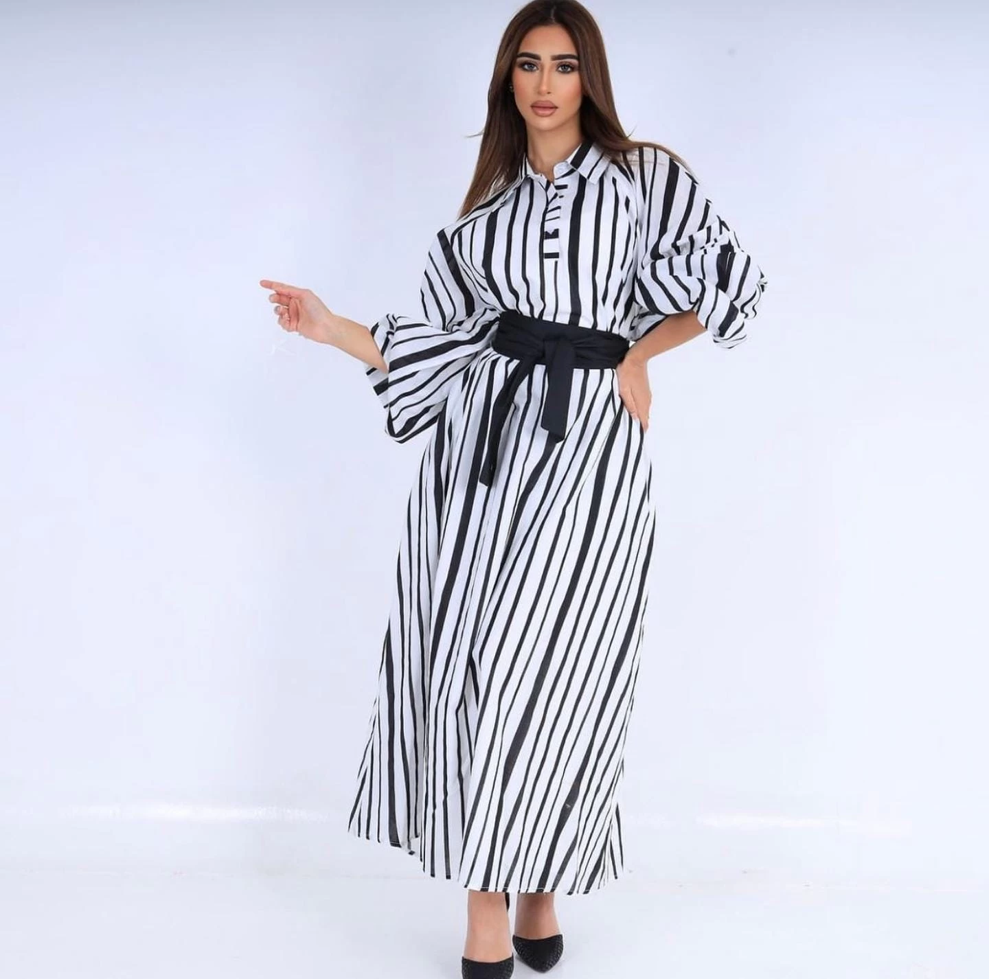 فستان طويل بخطوط سوداء وحزام على الخصر