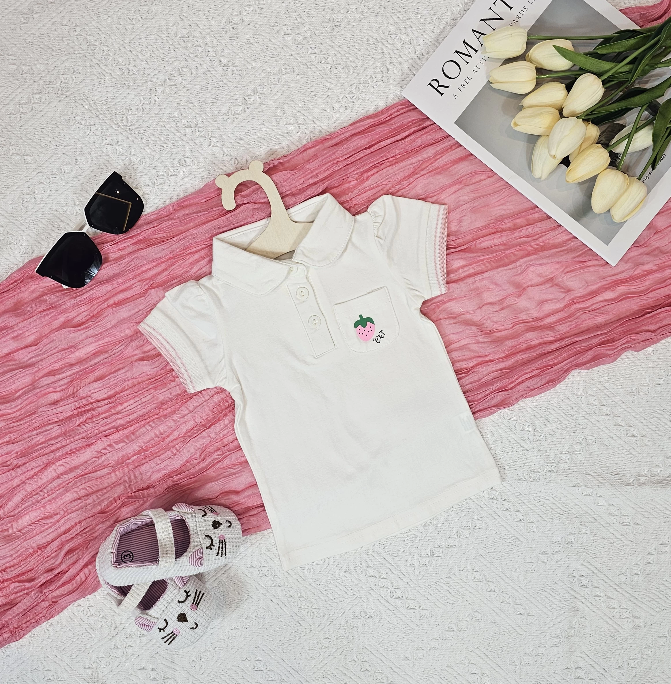 تيشرت بناتي صيفي باللون الابيض والوردي
