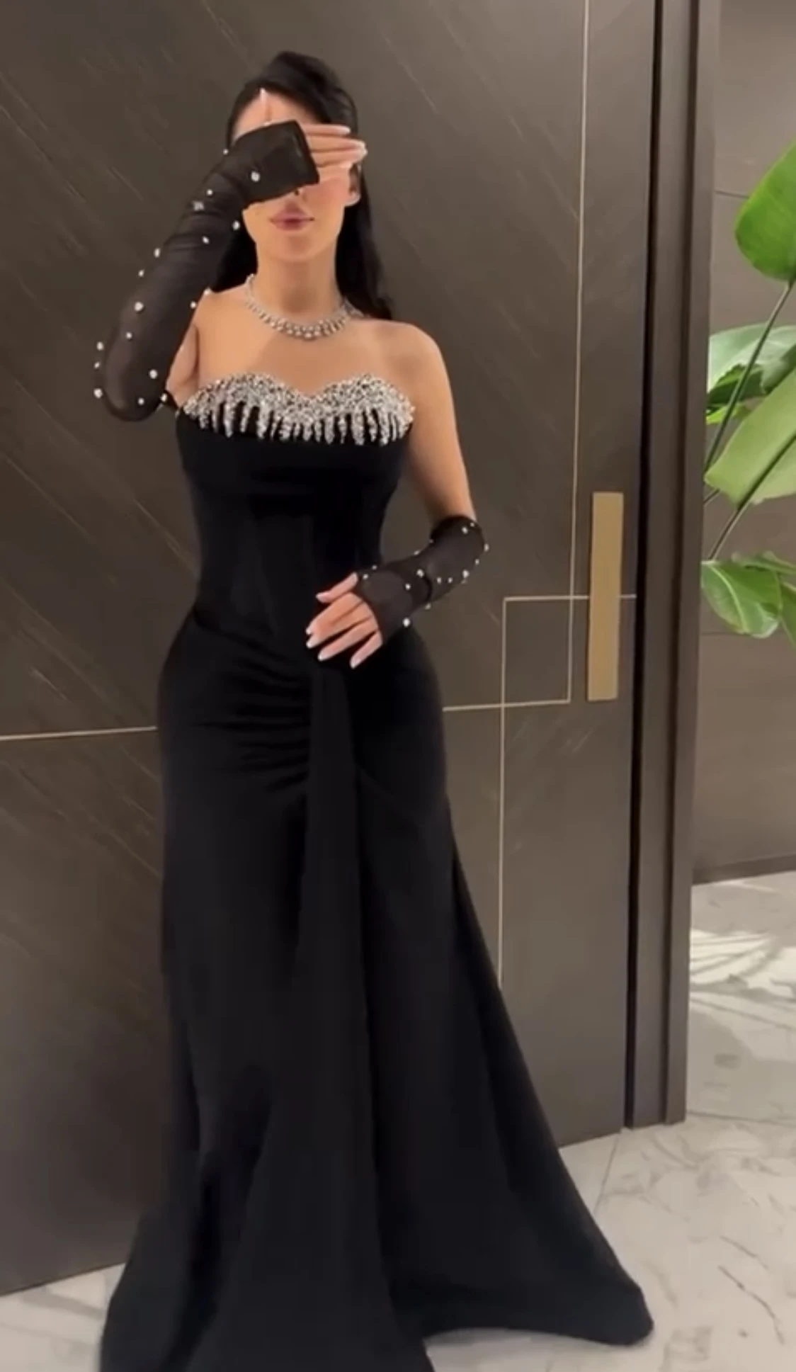 فستان أسود فاخر بكريستالات لامعة ولمسة أنثوية جريئة