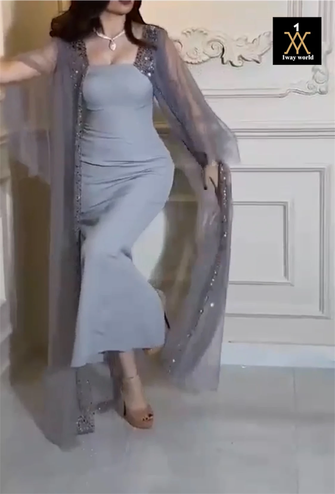 فستان سهرة رمادي بكاب شفاف مرصّع يفيض أناقة ورقيّ